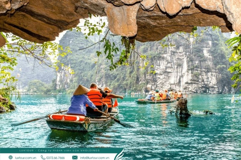 Tham quan Tràng An bằng thuyền là trải nghiệm chính trong tour Bái Đính – Tràng An 1 ngày. Mỗi chuyến đi kéo dài khoảng 2–3 tiếng trên sông, qua các hang động và đền đài. Để chuyến đi thoải mái hơn.