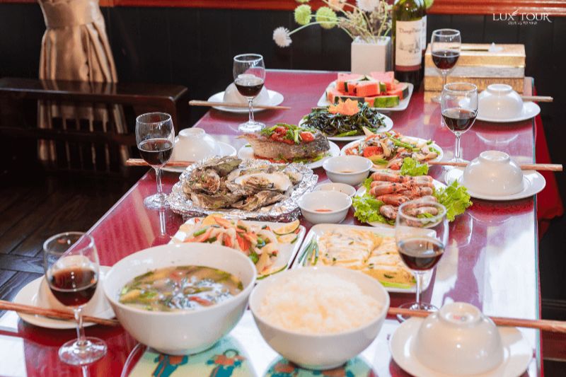 | 12:00 – 13:30 | Dùng bữa trưa hải sản trên tàu hoặc nhà hàng nổi | Các món ăn địa phương như cá song, mực, ngao hấp, tu hài... |